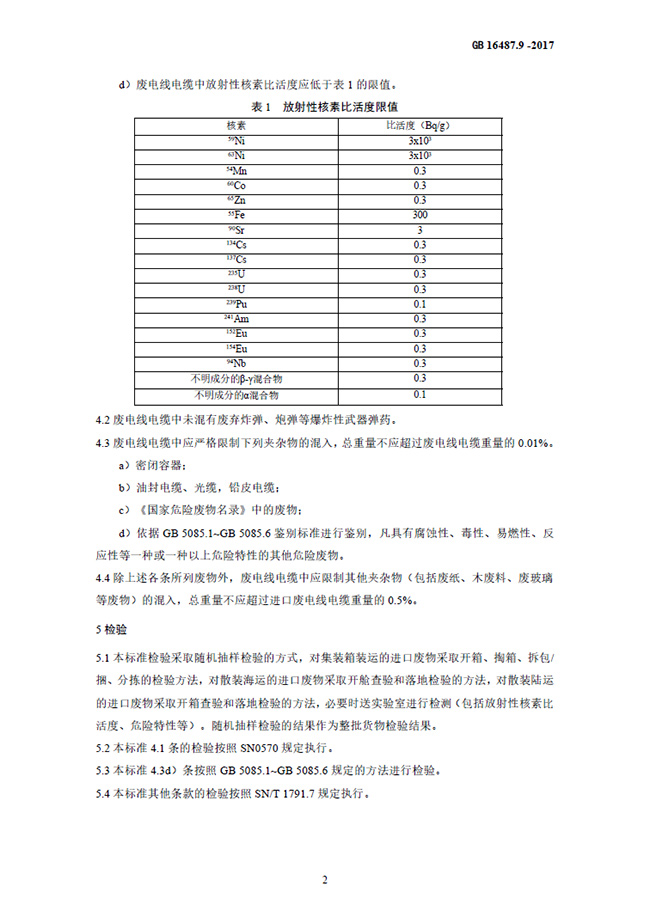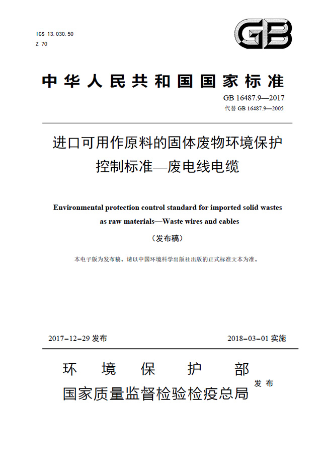 為貫徹《中華人民共和國(guó)固體廢物污染環(huán)境防治法》《中華人民共和國(guó)放射性污染防治法》等法律法規(guī),控制由于進(jìn)口可用作原料的廢電線電纜造成的環(huán)境污染,制定本標(biāo)準(zhǔn)。本標(biāo)準(zhǔn)規(guī)定了進(jìn)口廢電線電纜的環(huán)境保護(hù)控制要求。本標(biāo)準(zhǔn)是進(jìn)口固體廢物環(huán)境保護(hù)系列控制標(biāo)準(zhǔn)之一,適用于進(jìn)口可用作原料的固體廢物目錄中有關(guān)廢電線電纜的進(jìn)口管理。