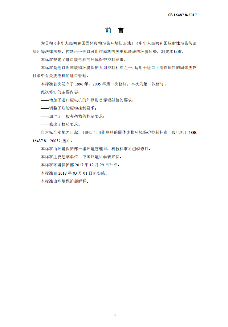 為貫徹《中華人民共和國固體廢物污染環(huán)境防治法》《中華人民共和國放射性污染防治法》等法律法規(guī),控制由于進(jìn)口可用作原料的廢電機(jī)造成的環(huán)境污染,制定本標(biāo)準(zhǔn)。本標(biāo)準(zhǔn)規(guī)定了進(jìn)口廢電機(jī)的環(huán)境保護(hù)控制要求。本標(biāo)準(zhǔn)是進(jìn)口固體廢物環(huán)境保護(hù)系列控制標(biāo)準(zhǔn)之一,適用于進(jìn)口可用作原料的固體廢物目錄中有關(guān)廢電機(jī)的進(jìn)口管理。