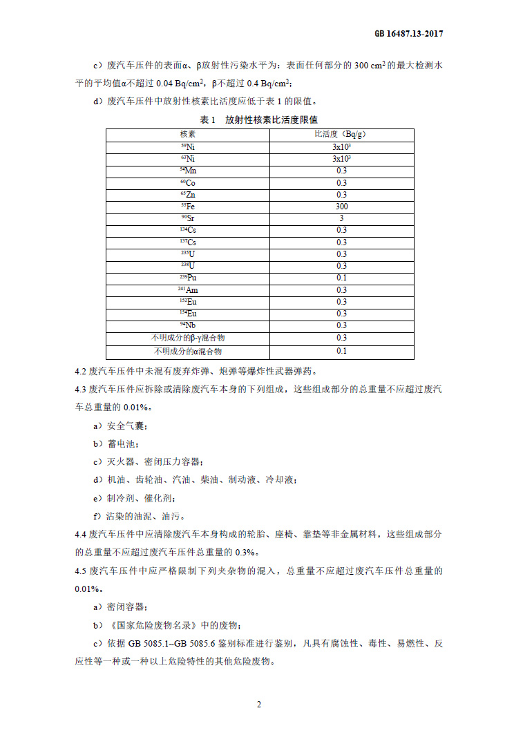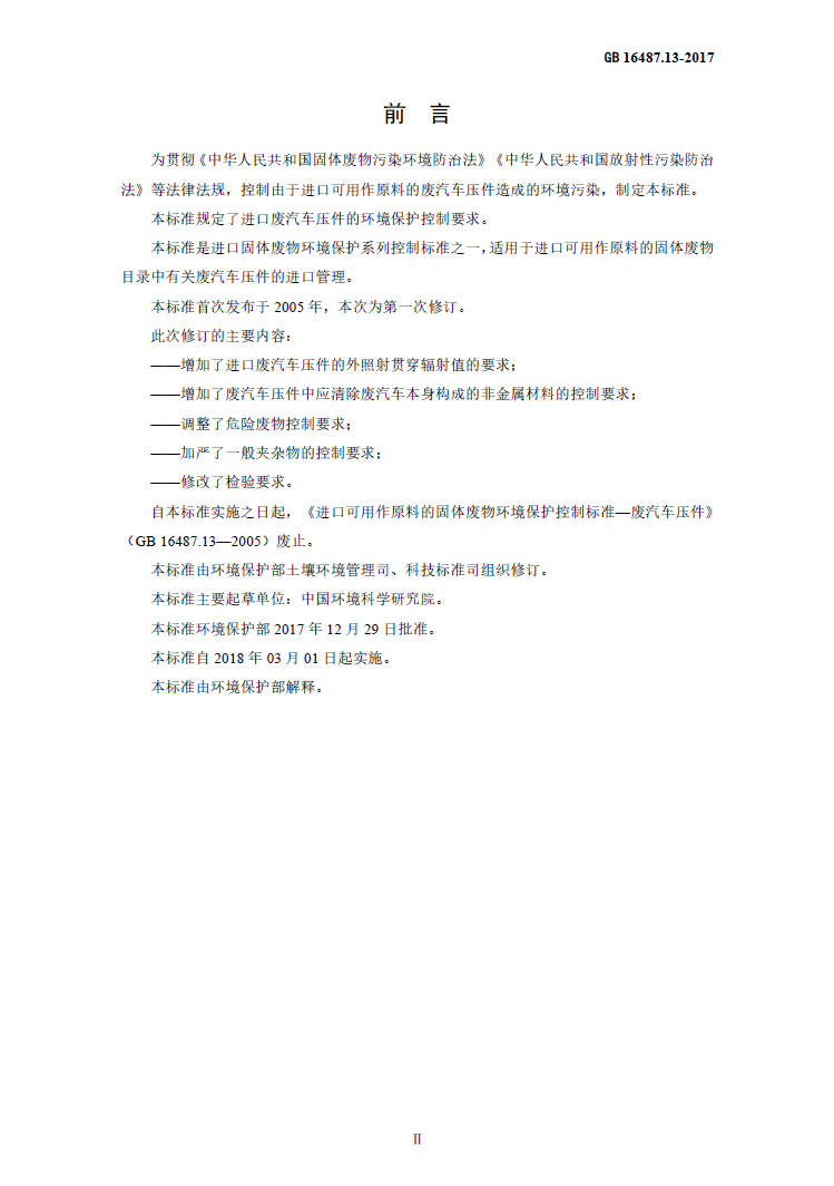為貫徹《中華人民共和國固體廢物污染環(huán)境防治法》《中華人民共和國放射性污染防治法》等法律法規(guī),控制由于進口可用作原料的廢汽車壓件造成的環(huán)境污染,制定本標準。本標準規(guī)定了進口廢汽車壓件的環(huán)境保護控制要求。本標準是進口固體廢物環(huán)境保護系列控制標準之一,適用于進口可用作原料的固體廢物目錄中有關廢汽車壓件的進口管理。