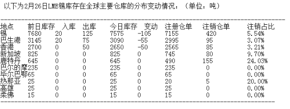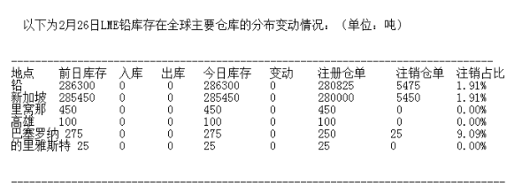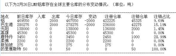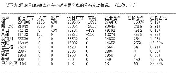 LME 2月26日有色金屬庫(kù)存分布情況