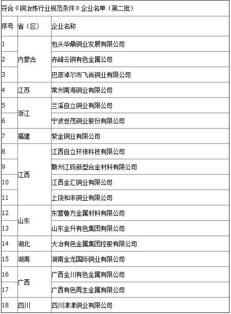 根據(jù)《銅冶煉行業(yè)規(guī)范條件》(工業(yè)和信息化部公告2014年第29號),經(jīng)企業(yè)申報(bào)、省級工業(yè)和信息化主管部門核實(shí)、專家組審核、現(xiàn)場核查及網(wǎng)上公示,現(xiàn)將符合《銅冶煉行業(yè)規(guī)范條件》企業(yè)名單(第二批)予以公告。