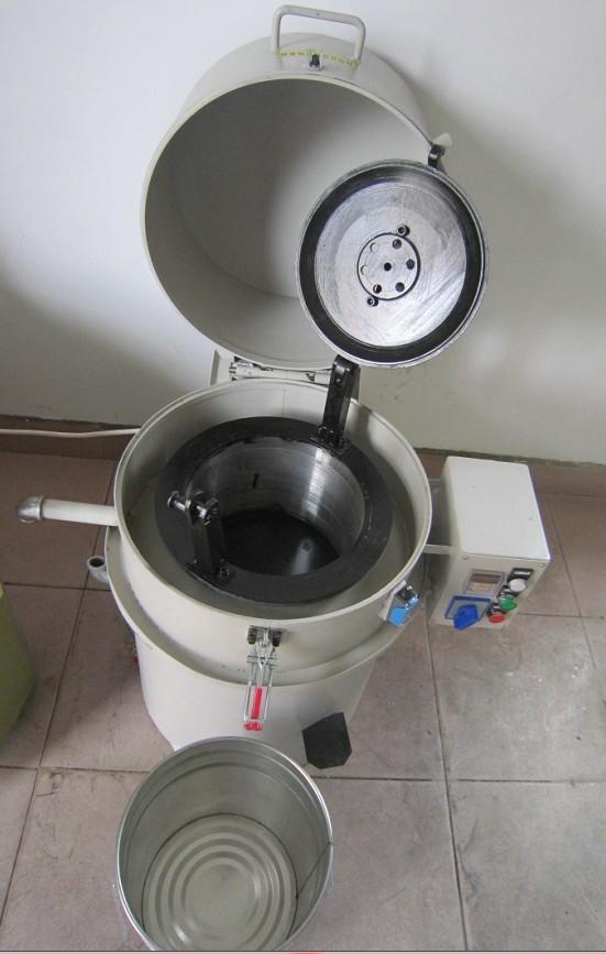 脫油機工作時,利用離心率把油拋向外壁的四周及上方的頂部,這兩部分是收集油的部分,另外,在脫油機的內壁有數(shù)十個豎直的槽,統(tǒng)一的排列,可以使液體流暢地流動,特別遇到細小的東西的時候,金屬絲的內壁殘留物,外部形成一個真空空間,把油充分脫凈。
