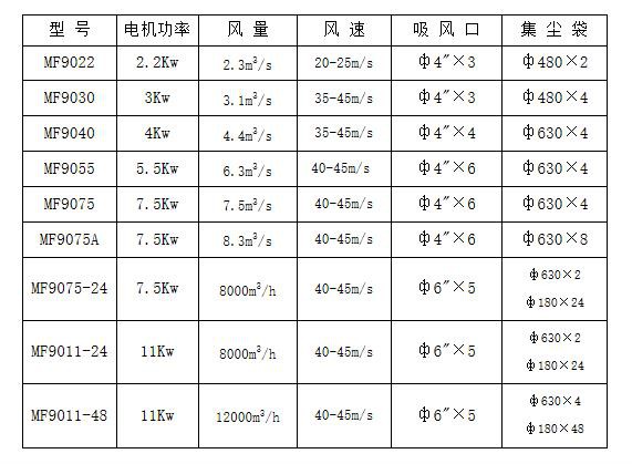 型 號 | 電機功率 | 風 量 | 風 速 | 吸 風 口 | 集 塵 袋 |