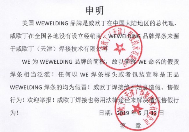 強調(diào):威歐丁是美國WEWELDING品牌的總代理,威歐丁在各地沒有設(shè)立經(jīng)銷商,WEWELDING630(簡稱威歐丁630)耐磨焊條來源于威歐?。ㄌ旖颍┖附蛹夹g(shù)有限公司!