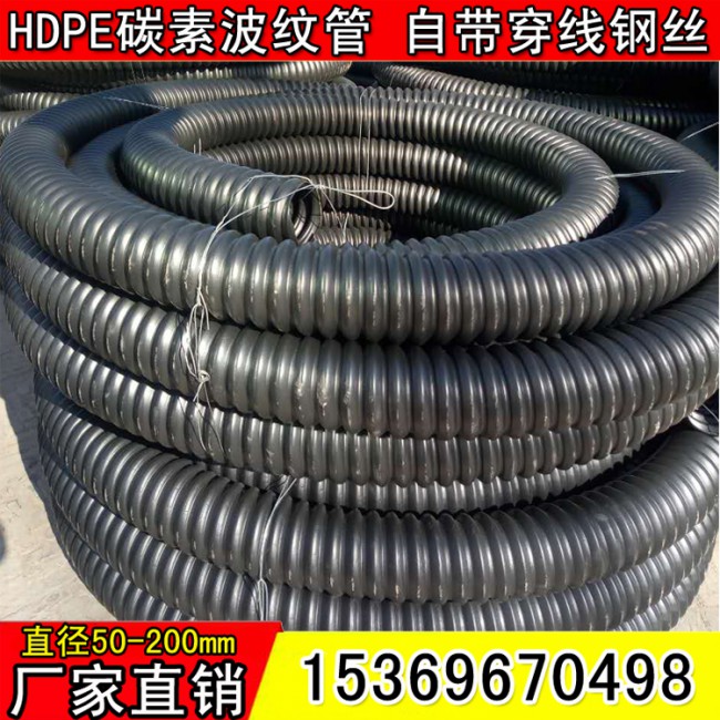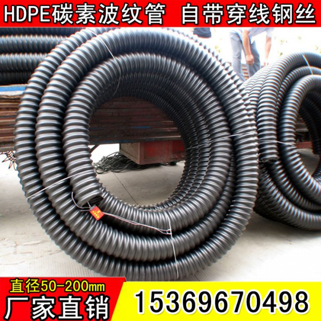 碳素管,碳素螺紋管,單壁螺旋管,碳素波紋管,黑色盤管是高密度聚乙烯和改性碳素為主要原料,采用基礎(chǔ)成型和獨(dú)特的旋轉(zhuǎn)成型工藝技術(shù)生產(chǎn)的新型電力線纜保護(hù)管道。它以其特有的螺旋狀物造型,具有高強(qiáng)度、高韌性、耐腐蝕、耐高溫、絕緣電阻高、阻燃性好、質(zhì)量輕壽命長(zhǎng)、不易變形等多種優(yōu)點(diǎn),該產(chǎn)品以廣泛應(yīng)用于城市路燈線路地埋工程,電氣化鐵路電力、通信電纜的敷設(shè)地埋工程,告訴公路電力、通信設(shè)施的建設(shè)與改造工程,住宅小區(qū)建設(shè)工程及公園和大型娛樂(lè)場(chǎng)所的地埋電纜工程,是目前最理想的地埋電纜護(hù)套管材。