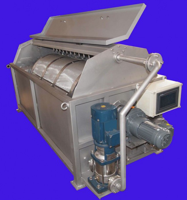 裝置由設(shè)備結(jié)構(gòu)模塊、過濾模塊、驅(qū)動系統(tǒng)、反沖洗系統(tǒng)、自控系統(tǒng)組成。污水流入空心轉(zhuǎn)鼓內(nèi),由于重力的作用由濾網(wǎng)內(nèi)側(cè)向外側(cè)流出,水中的懸浮物被截留在不銹鋼濾網(wǎng)內(nèi)側(cè)。轉(zhuǎn)鼓緩緩轉(zhuǎn)動,反沖洗泵抽取濾后出水對網(wǎng)進行反沖洗。沖洗水通過位于轉(zhuǎn)鼓頂部的噴頭由濾網(wǎng)外側(cè)向內(nèi)側(cè)對濾網(wǎng)進行沖洗,沖洗下來的顆粒物質(zhì)由反沖洗水收集槽收集,并通過排污管排出設(shè)備。