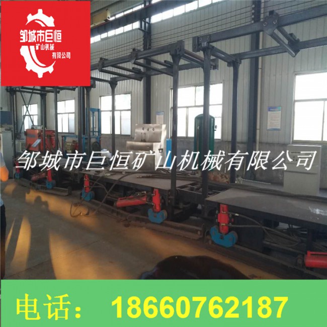 液壓自移式平板車上面安裝固定設(shè)備后,其首尾通過連接板順次連接,行走軌道通過中間段連