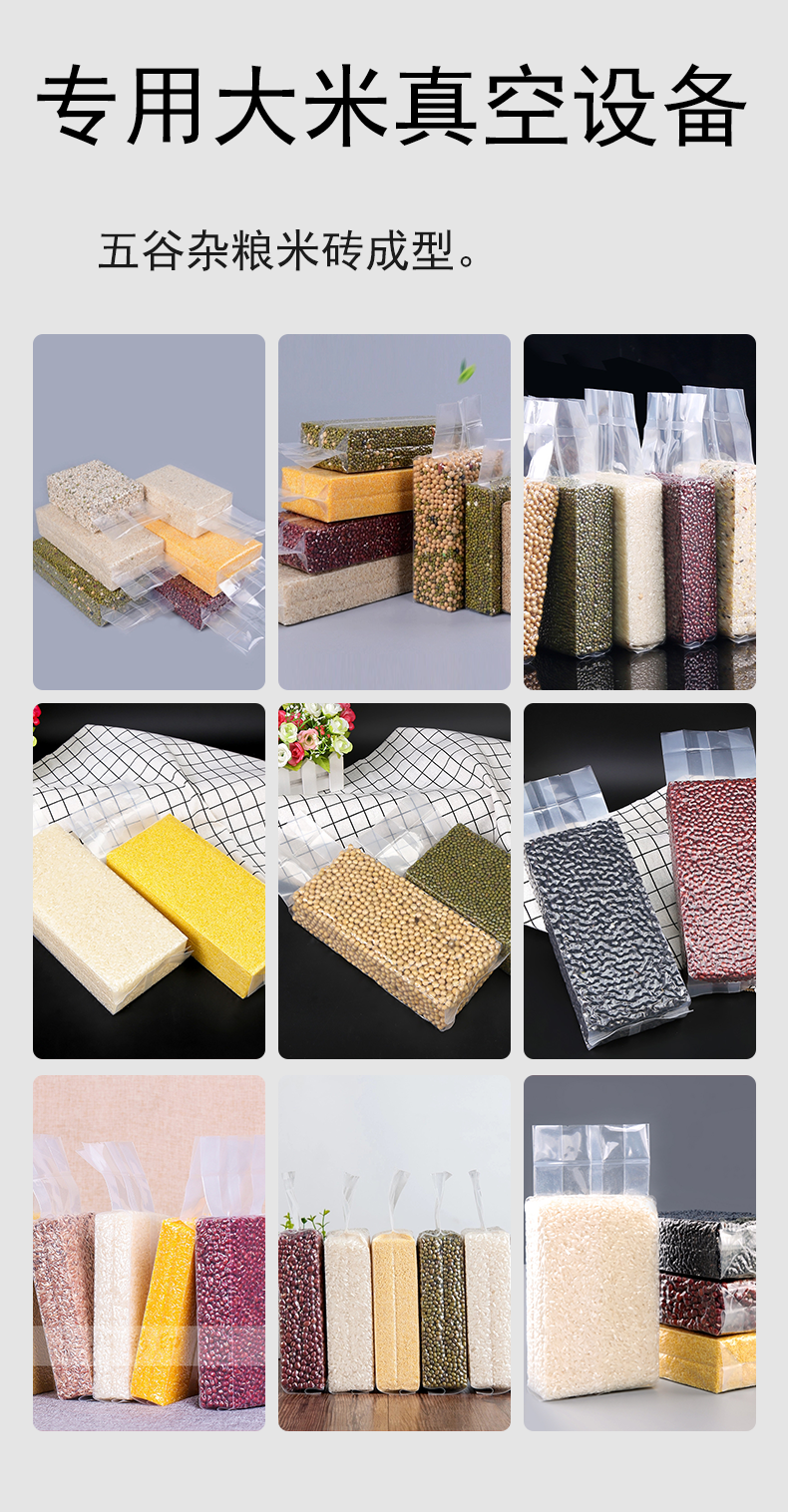 大米米磚真空包裝機 武漢大米米磚真空包裝機是加深型直空包裝機,自帶有多種不同大小的米磚模具,直空句裝后可以延長產品的保質期,起到耐氧化、防蟲蛀、霉變、防受潮等功能,是一款專為直空包裝大米米磚的機型產品。該直空包裝機是中小型大米生產廠家直空包裝的*機型。