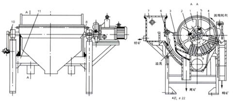它主要由磁系、圓筒、分選槽、傳動裝置、以及給料、排料和溢流裝置組成。
