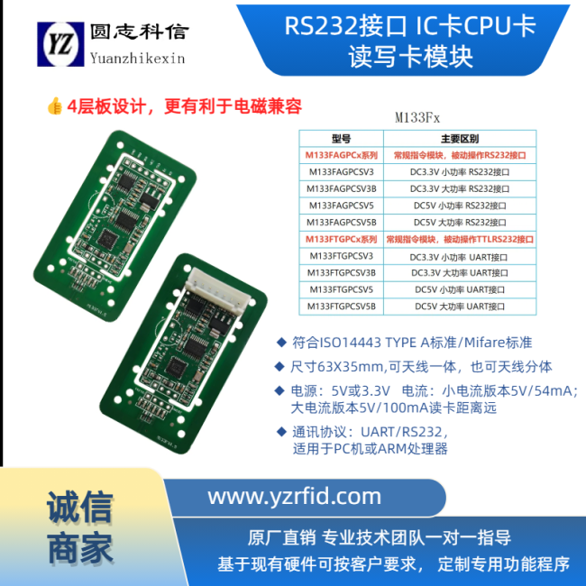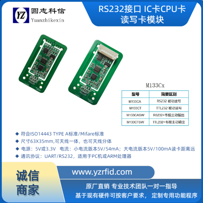 M133CT | UART | S50,S70,FM11RF08,Ultralight,Ntag,FM1208 T=CL CPU卡及其兼容卡 |