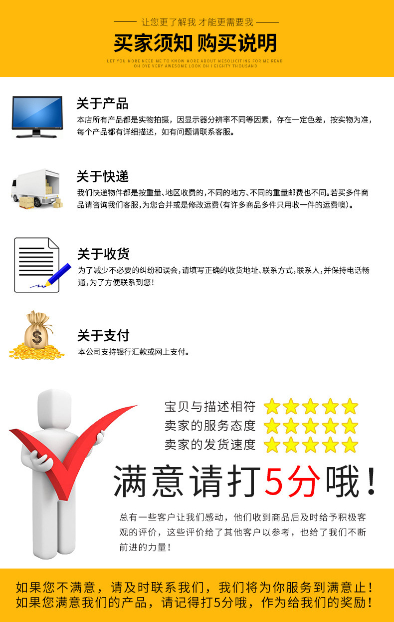 1、關(guān)于產(chǎn)品質(zhì)量:網(wǎng)絡(luò)交易,誠(chéng)信為王。作為淘寶店鋪的戰(zhàn)略合作伙伴,我們對(duì)產(chǎn)品的要求和把控極其嚴(yán) 格,所有的產(chǎn)品在出貨前均會(huì)經(jīng)過采購(gòu)、QC、倉(cāng)管相關(guān)人員的三次質(zhì)檢,確保發(fā)貨到您手里的產(chǎn)品是合格產(chǎn)品,萬一產(chǎn)品有質(zhì)量問題(貨流量大,疏漏在所難免,在此深表歉意),請(qǐng)?zhí)峁﹫D片證據(jù),并在48小時(shí)內(nèi)反饋。